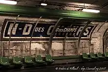 From the 1950s until 2007, the original tiling on the platforms by Boulenger & Co. was hidden behind a green metal sheath (carrossage). It was removed as part of the "Un métro + beau" programme by the RATP which were completed on 24 June 2008,[1] restoring its original Nord-Sud decor.