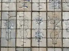 The architecture of the church is meant to recall the civilizations that were served by the Christian missions; the building is distinguished from many contemporary works through its use of reinforced concrete. Its architect, Paul Tournon, had already designed another church in the vicinity, that of Saint-Louis in Villemomble. At Notre-Dame-des-Missions, Tournon took his inspiration from the architecture of five continents. The façade of the church is designed with three roofs at the entrance, superimposed one upon another in the Chinese style and decorated with Chinese ideographs. To these are added recumbent angels, Buddhist figures, fetishistic objects, and African-inspired designs. The bell tower is designed in the shape of a minaret. The whole facade is covered in blue and white ceramic tile in a pattern created by Lorymi and Raymond Virac, using a new type of brickwork developed in 1930 by Marguerite Huré.[2] The cement sculptures on the bell tower, depicting the four human races, were sculpted by Carlos Sarrabezolles, who had previously worked with Tournon on the bell tower at Saint-Louis. At the top of the tower is a statue of the Virgin Mary standing on a globe; it is the work of Roger de Villiers.[1]