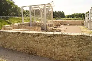 Water supply to the fortress, particularly the baths including the nearby nymphaeum and to the town was ensured by three known aqueducts, one of which was at least 9 km long and fed the distribution tank (castellum divisorum) at the south-east corner of the fortress.[12]