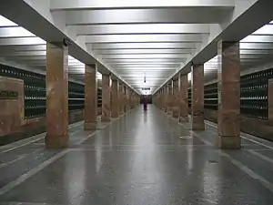 The station was designed by architects N. Shumakov, G. Mun, and N. Shurygina and has a tri-vault column structure. Novoyasenevskaya station walls and pillars are faced with deep pink marble and dark green metallic.
