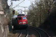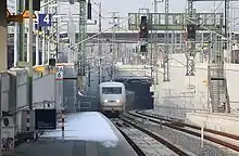 In the new section, the track was built with a gradient of up to 2.0% with a cant of up to 160 millimetres and a cant deficiency (at 300 km/h) of 100 millimetres. A longitudinal gradient of 2.0% is achieved in nine sections from 600 to 1,815 metres in length (in Geisberg tunnel). The railway embankments reach heights of up to 16 metres.[7] 55 percent of the new line is on curves,[8] with a minimum curve radius of 4,085 meters.[9] The crossover to the opposite track branching off at the stations can be operated at 130 km/h, those on the platform tracks at 100 km/h.[10] The establishment of a crossover in Lohen (line kilometre 42) was planned,[11] but was later realised only as a block post. The cross-section of the running tunnel is 92 square metres, the distance between the tracks is 4.50 metres.[12]