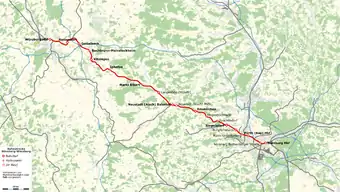 The Aurach viaduct in Emskirchen was rebuilt from May 2014 to November 2016.[18] This 527.5 m-long and 40 m-high bridge made of reinforced concrete replaced the old bridge and lies about 90 m north of it. The route was changed over a length of 1.75 km.[19][20][21] The solution had been identified in an EU-wide planning competition.[21] An improvement in the alignment allowed speeds over the new bridge to be raised from 110 to 140 km/h for conventional trains and from 140 to 160 km/h for tilting trains.[22]