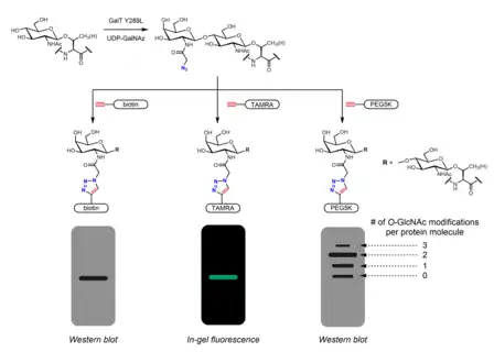 Chemoenzymatic labeling provides an alternative strategy to incorporate handles for click chemistry. The Click-IT O-GlcNAc Enzymatic Labeling System, developed by the Hsieh-Wilson group and subsequently commercialized by Invitrogen, utilizes a mutant GalT Y289L enzyme that is able to transfer azidogalactose (GalNAz) onto O-GlcNAc.[28][39] The presence of GalNAz (and therefore also O-GlcNAc) can be detected with various alkyne-containing probes with identifiable tags such as biotin,[39] dye molecules,[28] and PEG.[29]
