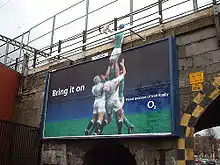 Telefónica O2 was the sponsor of the Cork GAA Football and Hurling teams and the Irish rugby team. The partnership with Irish rugby went interactive in 2006, when Ireland fans were offered access to daily updates from head coach Eddie O'Sullivan. In 2009, O2 launched their 'BeTheDifference' integrated advertising campaign[23] where fans had the chance to have their names included on the O2 Rugby posters and on the Irish Rugby players' jerseys.[24] The integrated campaign was created by O2's two Irish advertising agencies: McConnells (above-the-line) and Brando (below-the-line).[25] The interactive campaign won an award at the 2009 Kinsale Sharks.[26]