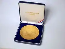 The winner of the Award is presented with a medal, certificate and a monetary prize of up to €90,000.[2] As an essential partner in both establishing and maintaining the Award, the commemorative medal features an engraving of the OPCW headquarters building with the official coat of arms of the City of The Hague au verso. This reflects The Hague's stature as the international city of peace and justice,[3] and its historic support of the OPCW mission statement;[4] a ban on chemical weapons has been in effect in the Netherlands since the Hague Convention of 1899.