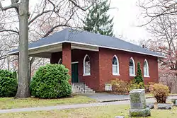 The Oakwood Chapel is a brown brick building with a hipped roof that extends outward from the building to form a porte cochere. The building has Gothic windows with raised brick, and contains an office, a crypt, and the main chapel.[2]