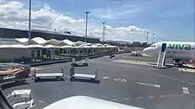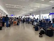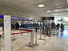 The passenger terminal is a single-story building with a total area of 7,548 square metres (81,250 sq ft). It accommodates both arrivals and departures for domestic and international flights. The departures area features a check-in area, a security checkpoint, and a departure concourse featuring a VIP lounge,[2][3] snack bars, souvenir shops, and eight gates that provide direct access to the apron, allowing passengers to board their planes by walking to the aircraft through a series of open-air walkways. The arrivals section is located at the southern end of the terminal and includes customs and immigration facilities, a baggage claim area, and an arrivals hall with car rental services, taxi stands, snack bars, and souvenir shops.