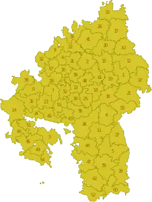 Chapter V of the Constitution contained detailed information on the administrative structure and rights of municipalities and official bodies. In particular, § 64 provided that Oberämter limits could only be changed by law, i.e. with the consent of parliament. This possibility was only used very sparingly; only in 1842 were major changes made, affecting around thirty municipalities.[7] A bill introduced by the government in 1911 to simplify administration in the sense of cost savings provided for only 42 Oberämter, but was rejected by the Chamber of Deputies.