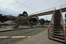 In the 1970s, Muni rebuilt the non-revenue trackage for regular service so that K Ingleside service could be extended to the new Balboa Park station. The extension included a new intermediate stop just east of Geneva Avenue, serving the San Francisco City College campus. After two students from the nearby Lick-Wilmerding High School were injured by a speeding car that decade while trying to cross Ocean Avenue, a pedestrian bridge was constructed over Ocean Avenue.[6] Designed by the city's Department of Public Works, the reinforced concrete bridge built in 1978 is 227 feet (69 m) long and 10 feet (3.0 m) wide, with staircases on both sides leading to each Muni platform.[7] The first revenue service to the station was on April 23, 1979, although service past Phelan Loop did not run at all times until March 17, 1981.[4]