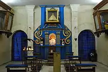 The church is fronted by a very large atrium fenced by a stone wall. The main facade has two bodies and a crest with both Baroque and Neoclassical elements. The first body contains the door arch and the second is marked by the choir window. Both bodies are flanked by columns with Ionic order capitols. The columns extend up the facade and have profuse vegetative decoration. At the top, there is a shell. In the interior is the Chapel of the Senor de la Sacristia, which is decorated in Neoclassical style.[3][7] In both the church and the chapel are found a large number of colonial-era santos (statues of saints), many executed in fine polychrome and well preserved.[12]
