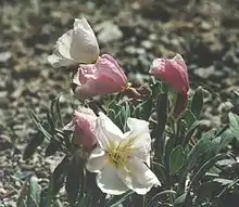 Oenothera californica ssp. eurekensis, the rare Eureka Dunes evening primrose, is a federally listed endangered species endemic to only a few occurrences in the Eureka Valley Sand Dunes in the Eureka Valley of Inyo County, eastern California.[5] It grows alongside another local dune endemic, the endangered Eureka Valley dune grass (Swallenia alexandrae).[6] It is sometimes listed as its synonym Oenothera avita ssp. eurekensis.