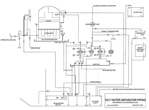 Bilge water is a nearly-unavoidable byproduct of shipboard operations. Oil leaks from running machinery such as diesel generators, air compressors, and the main propulsion engine. Modern OWSs have alarms and automatic closure devices which are activated when the oil storage content of the waste water exceeds a certain limit(15ppm : 15 cm3 of oil in 1m3 of water).