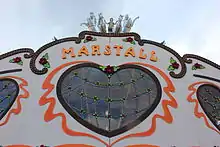 The Marstall took over the place of the Hippodrom as of the Oktoberfest 2014.[10] The host of the tent is the Able family. The Marstall offers 3200 seats. Another 1100 people find room in the beer garden and at the bar. Providing brewery, as by the predecessor Hippodrom, is the Spaten-Franziskaner brewery. Even musically the Marstall follows in the tradition of the Hippodrom, with performances from the "Münchner Zweitracht" and "Die Oberbayern", along with others.[11]