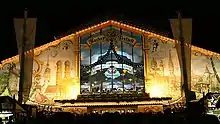 The Hofbräu tent is, with a total of almost 10,000 seats, the largest beer tent at the Oktoberfest (6,018 seats and 1,000 standing places indoors, and an additional 3,022 seats outdoor).[12] It has been under the leadership of the Steinberg family since the 1980s,[13] to which is also the tenant of the Hofbräuhaus cellar's since 1995. Under the leadership of the family, significant structural change were carried out in the tent. The only standing area with 1,000 places can be found in the Hofbräu-festival tent. In the tent, 12 quintal hop vines, the harvest an entire hop filed, are hung as decoration. The tent is erected on an area of over 7,000 m2. In the almost two weeks of the festival, more than 782,400 liters of beer, 70,700 BBQ chicken halves, 4,200 pork hocks and 6,200 pork sausage servings are consumed.[14]