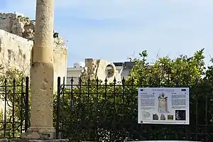 The site of the old parish church remained the property of the ecclesiastical authorities.[3] The ruins were eventually neglected and used for agricultural purposes, with parts of the structure being buried under soil.[2] An orchard with fruit trees and prickly pears was established on the site.[3][4] Part of the sacristy was converted into a dwelling, and it did not fall into ruin like the rest of the church.[6] A stone cross known as is-Salib tad-Dejma was built nearby, probably to mark the location of the former church,[7] and a niche with a relief of Saint Mary and souls was installed above a doorway leading to the ruins.[8]