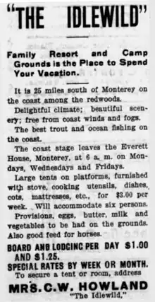In 1900, the county improved the road south to the forks of the Little Sur River.[29] Charles Howland, who drove the mail stage between Monterey and Big Sur, built the Idlewild Hotel in about 1900 on the Old Coast Road where it crossed the Little Sur River. The Pfeiffer family's hospitality was enjoyed by friends and strangers alike for years. They finally began charging guests in 1910, naming it Pfeiffer's Ranch Resort, and it became one of the earliest places to stay.[30]