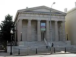 Built between 1838 and 1839, this historic structure is a two-story, rectangular, brick and Vermont marble building. The front facade features a pedimented portico with six two-story, Doric order columns. Designed in the Greek Revival style, this building housed Erie's post office until 1867, served as the Customs House for the port of Erie from 1849 to 1888, and later housed a Grand Army of the Republic post and the Erie County Historical Society.[3] It is now part of a five-building complex of the Erie Art Museum.