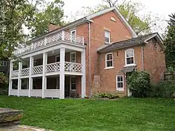 Morgan used clay from a nearby slope to make reddish bricks. He built the house two stories tall, with brick walls twenty-two inches thick at the base and narrower above. The style includes some of the Greek Revival elements that were popular at the time: the cornice returns, the unadorned window sills and lintels, and the sidelights and transom around the main entry. A chimney rose from each end. The house was heated by Franklin stoves. A summer kitchen stood at the northeast side of the house. The front porch was not part of the original design.[3]