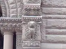 These influences can be seen at Old City Hall with many of its many arches and towers. Also, the use of different-coloured stone contributes towards the Romanesque style of design. The exterior and interiors of Old City Hall are crafted with great detail. On the clock tower, four stone gargoyles were placed near the top of the tower. Near the building's entrance, there are several grotesque faces carved in stone. Lennox included his own likeness next to the other carved faces which, tradition has it, represent city councillors. Lennox's own face is identified as one of the caricatures by his handlebar moustache.[19]
