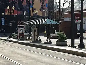 Old Town/Chinatown station is a MAX Light Rail station served by the Blue and Red Lines. It is located in the Old Town Chinatown neighborhood in Portland, Oregon and is currently the 6th stop eastbound on the Eastside MAX. It is also the last stop before crossing the Willamette River. It is next to the Portland Downtown Heliport. The station was previously also served by the Yellow Line, from 2004 to 2009, until that line's relocation to the Portland Transit Mall.