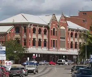 Old Townsville railway station, formerly the Great Northern Railway Station, is a three-storey red brick structure on Flinders Street in Townsville CBD, Queensland, Australia. The original terminus for the Great Northern Railway, the station became important in the economic growth of Townsville during the early 20th century. The building is featured in a number of famous photos taken during victory celebrations following World War II. A new station to service Townsville was built in the early 21st century and the platform is used for displays of historical photographs and articles. The building still houses Queensland Rail administrative offices.[1]