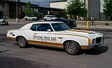 The 1972 Hurst/Olds was actually developed by Hurst Performance, and not Oldsmobile. Due to a tragic accident involving the 1971 Indy Pace car, a Dodge Challenger, the major auto manufacturers were reluctant to provide the pace car for the 1972 Indy race. Hurst Performance stepped up and volunteered to sponsor the 1972 Pace car. Oldsmobile provided the Cutlass Supreme coupe and convertible. It was the only time an Indy Pace car was sponsored by a manufacturer other than an automobile manufacturer, and first time to include a major supplier's name in the title. The 1972 edition of the Hurst/Olds had some of the lowest production numbers of any produced with a total of 629 made; 130 Convertibles, 220 hardtop with sunroof, 6 Station Wagons for Press and Ambulance use, and 279 hardtop cars. The only color available was Cameo White with reflective 3M gold stripes that were stickers, not paint. All of the cars had the W-25 Ram Air Hood and gold SS III Rally Wheels with a chrome bolt-on center cap and chrome beauty ring. The tires were Goodyear Polysteel Radials. The standard Hurst/Olds engine was the L75 455 cubic-inch Rocket V8 rated at 250 net horsepower (U in VIN). Optional at extra cost was the W-30 option with the L77 455, a blueprinted engine rated at 300 net horsepower (X in VIN). Both engines were mated to a Turbo Hydra-matic 400 transmission with console-mounted Hurst Dual-Gate shifter. All of the 1972 Hurst/Olds had the black Strato bucket interior with a center console. Special Hurst/Olds Pace Car badging adorned the glove box door and all 1972 Hurst/Olds' were identified with a W-45 Code on the cowl tag.