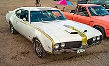 The first Hurst/Olds was the 1968 Hurst/Olds. It shared its body with the regular Oldsmobile Cutlass and 442, but had a unique Peruvian Silver and Black paint scheme. The Hurst/Olds was powered by a 390 hp (395 PS; 291 kW) @ 5000 rpm and a maximum torque of 500 lb⋅ft (678 N⋅m) @ 3200 rpm, 308° duration cam W-45 (without A/C) or 285/287° duration cam W-46 (with A/C), with a displacement of 455 cu in (7.5 L) Rocket V8, equipped with a single 4-barrel Rochester Quadrajet 4GC carburetor.[1][2] This engine was similar to the 400 hp (406 PS; 298 kW) W-34 455 engine offered in the Toronado and the 390 hp (395 PS; 291 kW) W-33 455 option available on the full-sized Delta 88. The W-45 and the milder W-46 engines differed in camshaft and cylinder head selection. The 455 was mated to a code OW three-speed Turbo-Hydramatic 400 transmission with console-mounted Hurst Dual-Gate shifter that permitted automatic or manually ratcheted shifting.[3]
