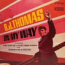 On My Way is a studio album by B. J. Thomas via Scepter Records.[1] Released in 1968, the album contained two singles: "The Eyes of a New York Woman" (which reached No. 28 in the U.S. and No. 29 in Canada) and "Hooked on a Feeling" (which peaked at No. 5 in the U.S. and No. 3 in Canada).[2] Also included on the album are covers of "Four Walls" (originally by Jim Reeves), "Light My Fire" (originally by the Doors) and "Mr. Businessman" (originally by Ray Stevens).