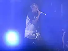 Both Beyoncé and Jay-Z sported multiple outfits throughout the different performances of the tour. One of the more prominent designers for the tour was Versace, in which Beyoncé wore both a fishnet and leather Atelier black bodysuit (complete with a plunging neckline, a fishnet head mask and high heel combat boots), as well as a colourful Atelier bodysuit from the designer. The leather Atelier black bodysuit took approximately 200 hours to craft and was used for the opening number of the tour, "'03 Bonnie & Clyde".[19] The colourful bodysuit was commented on by Versace who stated that the team had their inspiration from the street for the colour and added various crystals and stripes to show a "baseball vibe" while also trying to capture Beyoncé's energy.[20] Beyoncé's tour shoes were designed by Stuart Weitzman and Joker's Closet.[21] Other outfits included a denim jumpsuit and a bedazzled leotard bodysuit that "showed off her derrière".[22] Beyoncé also sported more thematic and dramatic pieces of clothing, including a full bridal veil and a sweeping train made of a black-and-white American flag.[17] The American flag outfit was designed by Riccardo Tisci of Givenchy and took over 500 hours to create. The American flag train was 16.4 feet long but weighed around 500 grams allowing it to fly in the wind. The individual stars on the outfit were hand-embroidered and its inspiration was said to be "American Danger: Bonnie & Clyde with a modern twist."[23] For the performance of "Ring the Alarm", Beyoncé returned to designer Vrettos Vrettakos (with whom she collaborated with notably on her previous solo tour).[24] Designed by Dennis Kolpodinos, Vrettakos produced a red, "couture 'crystal spirit' bodysuit" complete with fringe details on the limbs and "embellished with Swarovski crystals for stage-ready shine".[25]