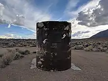 The 8 foot diameter steel pipe that was used to place the bomb remains at the test site. The top of the pipe was originally flush with the surface; however, the ground sank by nine feet following the explosion.[3] A plaque is mounted on the exposed pipe to commemorate the event.