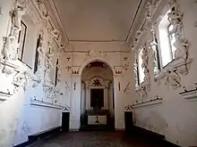 The oratory hall is preceded by an elegant staircase built in 1719 and an antiroom with maiolica pavement and a fresco depicting Jesus visits the jailed St Mercurius. The interior of the hall was stuccoed in 1678 by Giacomo Serpotta. The oratory has a choir with an organ; the ceiling was frescoed (and stuccoed) with a Glory of St Mercurius while the main altarpiece is a canvas depicting the Vision of the Madonna and Child by St Mercurius. The maiolica pavement of the main hall was completed in 1714-1715 by Sebastiano Gurrello and Maurizio Vagolotta, based on a design by the architect-priest Giulio Di Pasquale.[1]