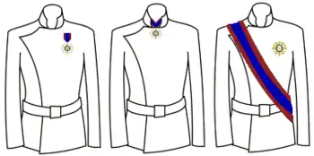 The decoration is formed by a golden round shield bearing the image of St. Ferdinand, edged by a blue-enameled round plate with the inscription "FIDEI ET MERITO", bordered by six golden rays edged by six white enameled lilies. The ribbon is blue and edged in dark red.