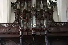 The 103 case-pipes of the Rug-Positief and 91 of the main case have a tin content of about 90% and have semicircular gilded lips.[5] It is the largest stock of original tin case-pipes in a Schnitger organ.