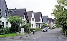 Despite massive citizen protests, the Cologne City Council decided in 2008 to build 640 residential units, 400 of which were to be integrated into apartment buildings. The citizens of Ostheim feared that the technical and social infrastructure of the district would not allow an influx of approximately 2,000 new citizens.[29] After several citizen hearings, the city of Cologne changed the development plan so that the foundation stone could be laid in the fall of 2012. The first apartment buildings were ready for occupancy in spring 2014. By 2018, 450 rental units, some of them subsidized with public funds, are to be built in mostly three-story apartment buildings, as well as up to 240 owner-occupied homes. Almost all streets were named after women who had a connection to the former state of Baden. The access road to the new development bears the name of the former Kalk district chairman Hans Offermann.[30][31][32][33]