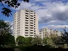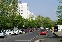 On the site of a former Prussian parade ground in the northwest of the town, housing for 2,500 people was created in the early 1970s in dense high-rise construction. Some of the residential buildings were subsidized with public funds, others were sold as condominiums. In the early days, the apartment buildings, which were up to 14 stories high, were regarded by the public as a prime example of modern subsidized housing, but just a few years later the residential location was perceived as unattractive by a large part of the population, so that the street gradually fell into disrepair. In 2002, the housing estate was included in the subsidy program Sozialraum mit erhöhtem Erneuerungsbedarf. In 2007, about 2800 people lived in the settlement, of whom about 70% had a migration background.[27]