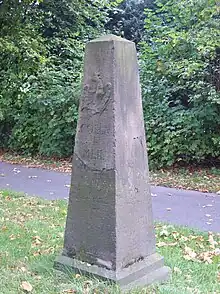 In 1818, a Prussian all-mile obelisk made of trachyte stone was erected at the corner of Bensheimer Street and Frankfurter Street. From this milestone the distance to Cologne is one Prussian mile (7532,48 m). Due to the soft stone, the monument is heavily weathered and in need of restoration. During an earlier restoration attempt, the last "e" of mile was removed, so the inscription below the Prussian eagle now reads, "Cöln 1 Meil."[39]