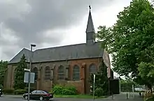 The neo-Gothic simple brick church of St. Servatius was built in 1906 according to the plans of the diocesan master builder Franz Statz and consecrated on December 23, 1906. From 1962 to 1964 the nave was extended by two bays according to the plans of the architect Kurt Faber. At the end of the reconstruction work, a marble altar from the church of St. Peter in Cologne was taken over. Instead of a tower, a high bell rider was placed on the gable roof of the nave.[36]
