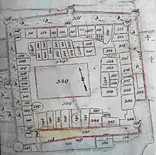 The fortress church is surrounded by two rings of walls and has a rectangular ground plan. The inner area measures 60 by 60 meters and is enclosed by a wall six to eight meters high. At each corner of the wall ring there is a corner tower about 25 meters high. The two eastern towers are round, the two western towers have a rectangular ground plan.[12] The towers are each 66 meters apart.[13] In the middle of the northern boundary wall there is a circular bastion as reinforcement. Around the inner wall runs a 7.5-meter-wide Zwinger.[12] The outer wall is five meters high, has tower-like corner bastions and another bastion on each of the long sides. No longer preserved is a round bastion on the east side of the outer wall.[12] At the southwest corner is a fifth defense tower. A sixth defense tower at the southeast corner of the outer wall has also not survived. Foundations of this tower were found during construction works in 1911. The part of the eastern wall adjoining the tower was also demolished.[12]