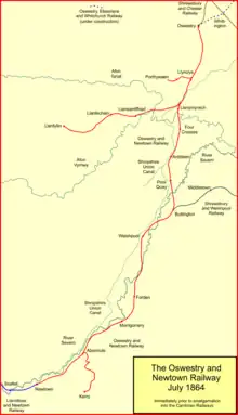The Shrewsbury and Welshpool Railway, sponsored at first by the LNWR, was opened throughout on 27 January 1862. This formed a shorter route from Newtown to the Midlands and London, and abstracted traffic from the O&NR. The S&WR was worked by the LNWR, and the GWR had running powers; in 1865 the two larger companies took ownership control of the line jointly.[1]: 35–40