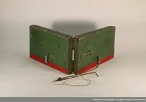 The otter is a fishing device constructed with two parts. An otter board and a fishing line. It is steered by pulling on the line then letting stack so the slide mechanism on the board operates to switch direction. It may be used from a boat or pulled from the shore. It is very difficult to retrieve from a boat once fish are on. The board steers away from shore when the line is pulled and positioned by giving more or less line out. The board will travel parallel to the line of travel of the fisherman. It was introduced into Norway by British anglers sometime around the middle of the nineteenth century. The first account of such a device is found in connection with irish sports fishermen in 1855.[1][2]