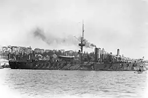 On 10 January 1913, Asar-i Tevfik supported another sortie by the fleet, this time patrolling off the Dardanelles while the rest of the fleet raided Imbros. While protecting the fleet's flank, she encountered Greek destroyers and forced them to withdraw after firing a few shots. Neither side scored any hits in the engagement.[32] The ship was lost while operating in the Black Sea against Bulgarian forces. On 7 February, the ship was ordered to proceed to Yalıköy, Çatalca to support a raid by the Army. The following day, the raid was launched on the town, but was quickly forced to withdraw from heavy Bulgarian resistance; Asar-i Tevfik was ordered to move in and shell the town, but ran aground on an uncharted sandbank at 12:45. On 10 February, salvage work began, beginning with the removal of equipment. By the 12th, all armament and coal had been removed, but the ship could not be freed.[33] Heavy seas and Bulgarian artillery damaged the wreck, which rendered her a total loss.[3][5]