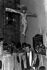 On Good Friday at 9:00 a.m., the Passion ceremony began, now called the Solemn Liturgical Action, with the reading of the Passion Gospel sung and the choir and priest in black vestments, using the compositions of the tractus from the Choir's archive and proceeding with the adoration of the cross, using the image of the Dead Lord. Later, in the procession with the Blessed Sacrament, an urn used on Holy Thursday was brought in solemn procession to the main altar while the choir intoned the vexilla regis, and continued the ceremony of Adoration of the Cross, with its own ritual. At the end of the day, until nightfall, the population would wait for the Burial Procession.[42]