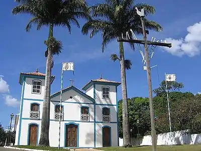 The reputation of the gold deposits on the margins of the Peixe River brought many adventurers to the Chapel of Rio do Peixe region who were responsible for building the Chapel of Saint Anne that, besides being the patron saint, was considered the owner of the place, showing the presence of Catholicism in a landscape where the houses or ranches were simple and small, made of wattle and daub technique, adobe, with a roof of buriti leaves with a ground floor, of one or two pitches and single storey.[22] The current one, the third one built, is located at the top of a square, a natural grassed elevated area, and has a facade with characteristics of the colonial period, formerly whitewashed and with turquoise blue frames, in a style that, at first, doesn't distinguish it from many others scattered throughout the recesses that sheltered populations in the Brazilian colonial period, and brings with it traits very characteristic of this period, such as having the local cemetery attached, being a great place of pilgrimage to the festivities celebrated there in July. In the mid-1980s, under the tutelage of the Goianésia Parish, the current temple underwent internal transformations, such as the removal of the original wood floor for a masonry and ceramic floor and lining with a plasterboard structure; two other rooms were added to the temple, one for the sacristy and the other to serve as the priests' dormitory during the festivities.[22]