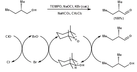 Catalytic oxoammonium oxidation may be facilitated using sodium hypochlorite as the terminal oxidant. The pH must be maintained below 10 using a buffer for the reaction to proceed. The active oxidizing agent of nitroxide is hypobromite anion; hence, potassium bromide is used as an additive.[3] No epimerization of α-stereogenic centers in carbonyl-containing products takes place.