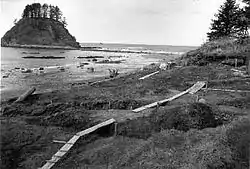The Ozette Native American Village Archeological Site is the site of an archaeological excavation on the Olympic Peninsula near Neah Bay, Washington, United States. The site was a village occupied by the Ozette Makah people until a mudslide inundated the site around the year 1750.[3] It is located in the now unpopulated Ozette Indian Reservation.