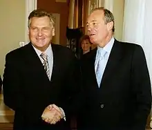 Péter Medgyessy (Hungarian pronunciation: [ˈmɛɟːɛʃi ˈpeːtɛr] ⓘ; born 19 October 1942) is a retired Hungarian politician who served as Prime Minister of Hungary from 27 May 2002 to 29 September 2004.[1] On 25 August 2004, he resigned over disputes with coalition partner Alliance of Free Democrats, but remained as acting prime minister for a 30-day period as required by the Constitution, and a few additional days until his successor Ferenc Gyurcsány was confirmed by the National Assembly.[2][3]