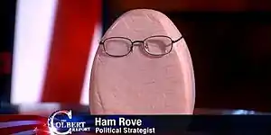 - Ham Rove – A raw canned ham with glasses that stood in for Republican strategist Karl Rove in various discussions of statements Rove had made or topics like Super PAC's which Rove was related to. After the 2012 election, fearing reprisal for not wielding enough influence with his Colbert Super PAC, Colbert stabbed and killed Ham Rove. Colbert Super PAC's website featured a memorial to Ham Rove, including his list of ingredients.