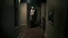 Unlike the third-person perspective in Silent Hill games, P.T. uses a first-person perspective,[4] which centers on an unknown protagonist, controlled by the player, who awakens in a haunted suburban house[5] and experiences supernatural occurrences.[6] Available areas to explore in the home consist of an L-shaped corridor with two rooms adjacent to it: a bathroom, and a staircase which leads to the room in which the player starts a loop, or a continuous reincarnation of the corridor.[2][5] The only actions the player can use are walking and zooming.[4] To progress, the player must investigate frightening events and solve cryptic puzzles.[5][7] Each time a loop is successfully completed, changes appear in the corridor.[2] Additionally, the player encounters a hostile ghost named Lisa.[2] If she catches the protagonist, there may be a random chance of triggering a jump scare when turning the camera horizontally, in this case the current loop starts again.[2]