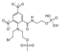 PR-104 is a drug from the class of hypoxia-activated prodrugs (HAPs),[1] which is being researched as a potential anti-cancer therapeutic agent. It is a phosphate ester “pre-prodrug” that is rapidly converted to the HAP PR-104A in the body. PR-104A is in turn metabolised to reactive nitrogen mustard DNA crosslinking agents in hypoxic tissues such as found in solid tumours.[2][3][4] Following initial clinical studies,[5][6] it was discovered that PR-104A is also activated by the enzyme AKR1C3, independently of hypoxia.[7] Hypoxia in the bone marrow of patients with leukaemia,[8][9] and high activity of AKR1C3 in some leukaemia subtypes [10][11][12] has led to interest in clinical trials of PR-104 in relapsed refractory acute leukaemias.[13][14]