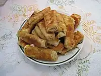 Paçanga böreği is a type of börek made with yufka filled with cheese, sujuk, tomato, parsley and pepper.[1] Each material is chopped into thin or small pieces, and rolled in the dough as in sigara böreği, but larger. The pastries are fried and served hot.